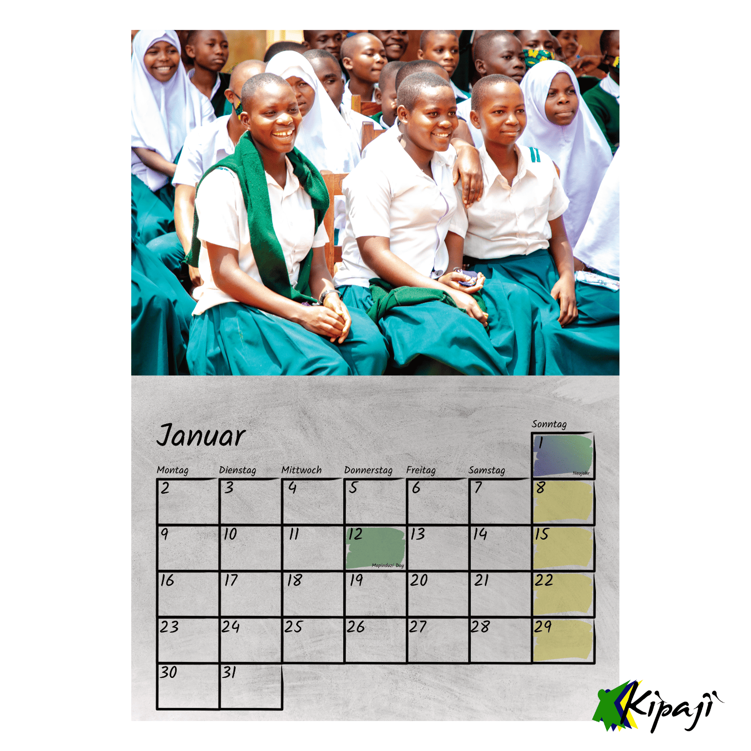 Im Kalendarium sind sowohl die bundesweiten deutschen, als auch die tansanischen gesetzlichen Feiertage mit Kurzerklärungen verzeichnet. Außerdem bietet das Kalendarium genug Platz für eigene Notizen oder Termine. Das Kalendarium ist sowohl mit Bleistift als auch Kugelschreiber beschreibbar.