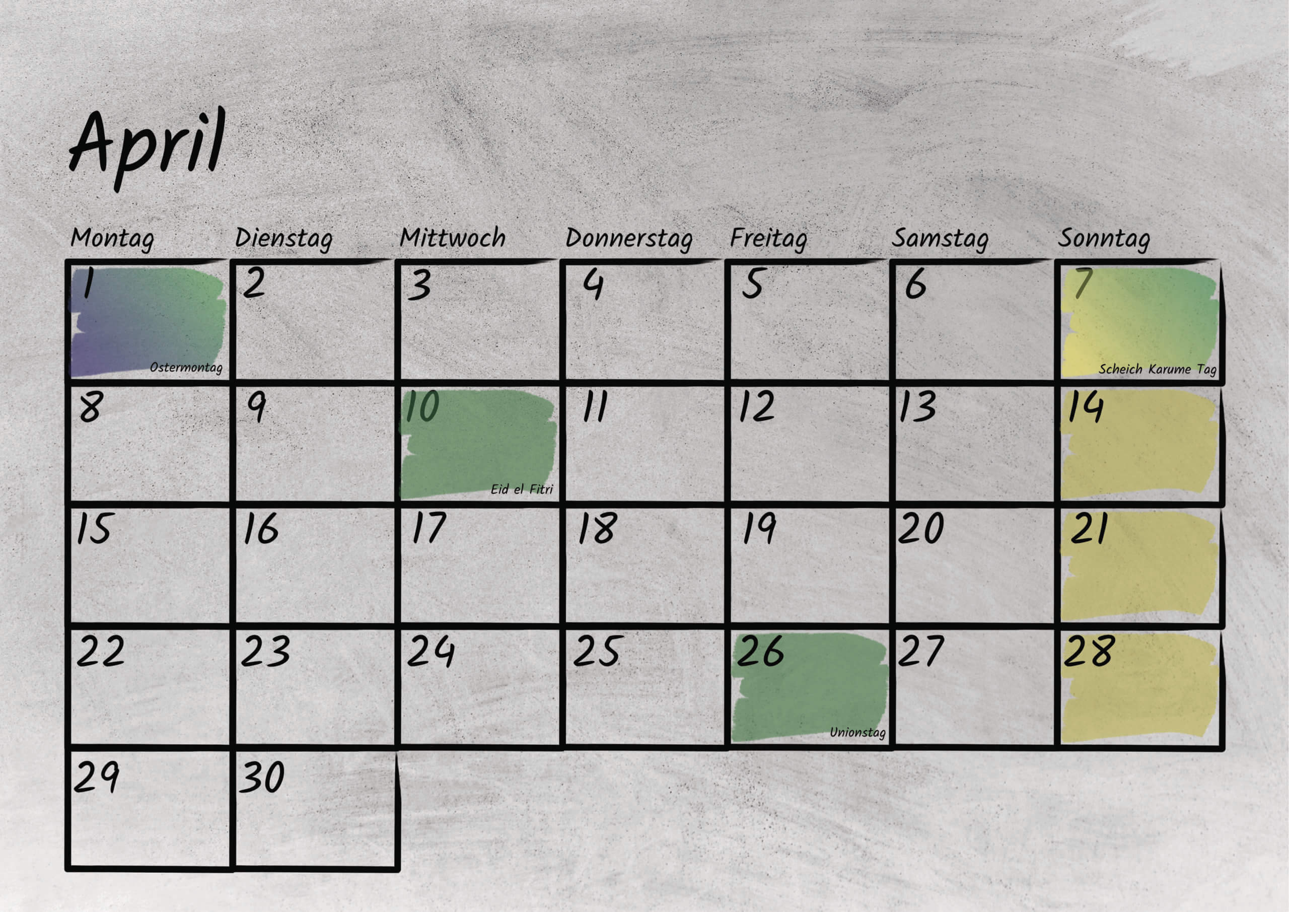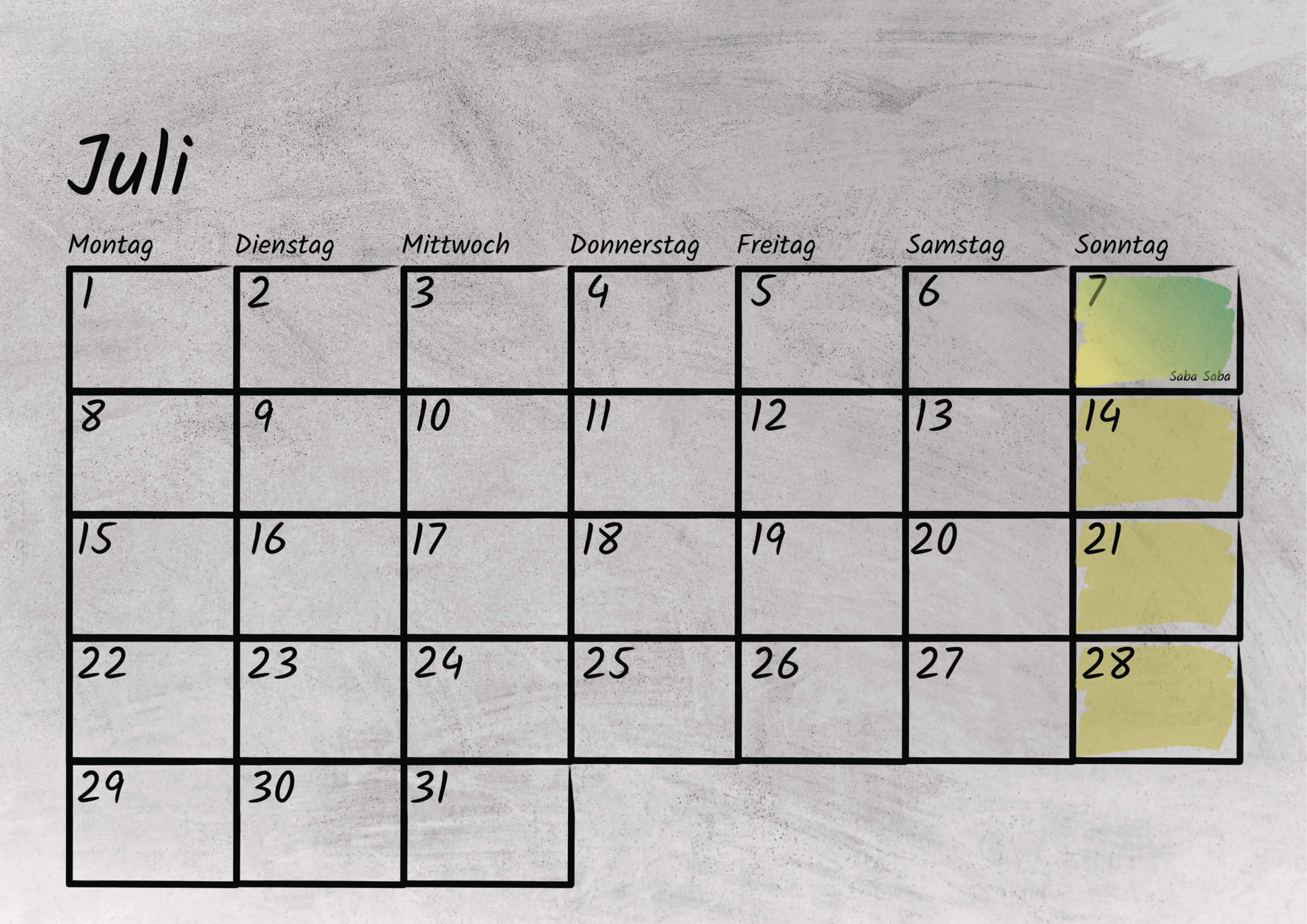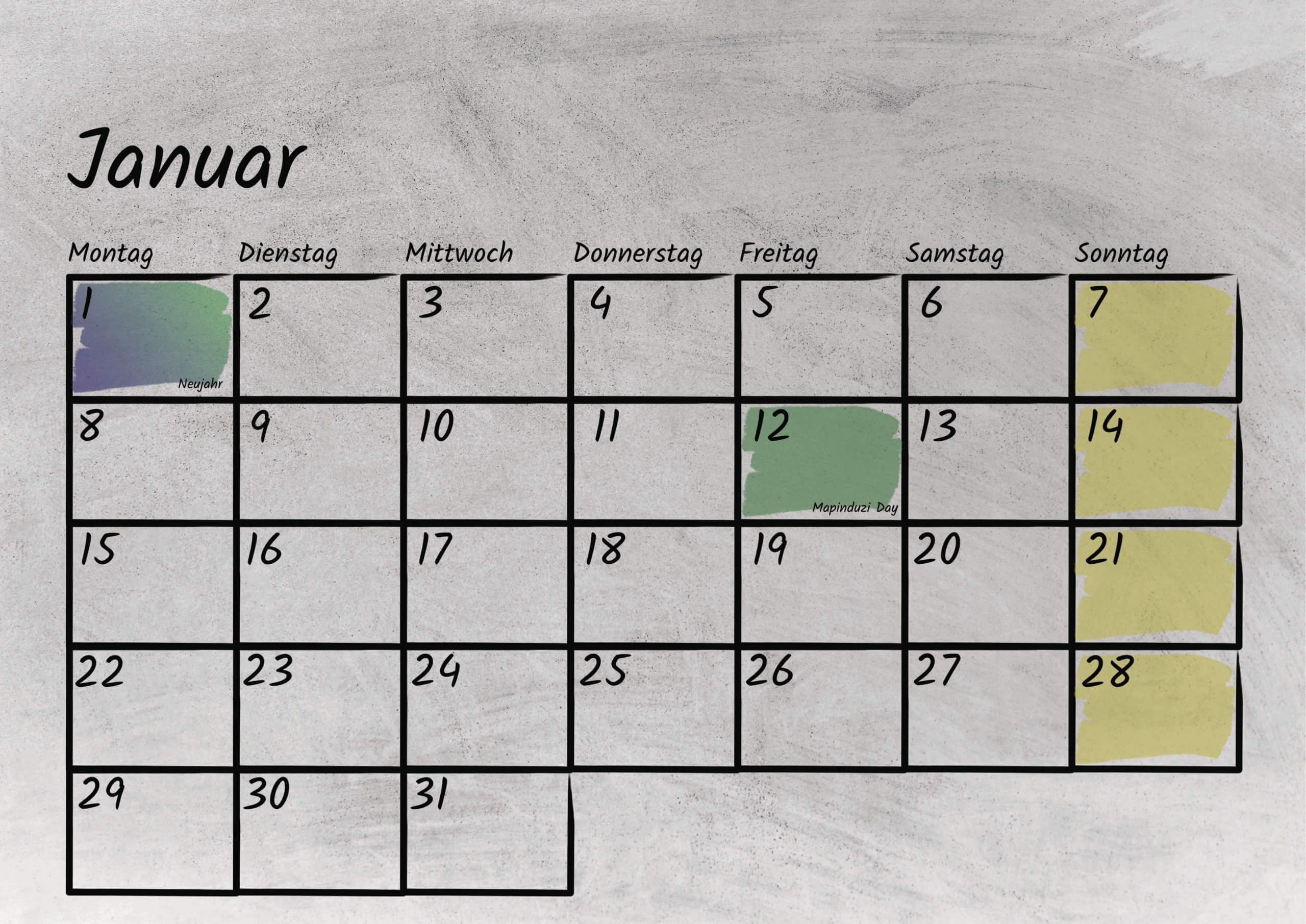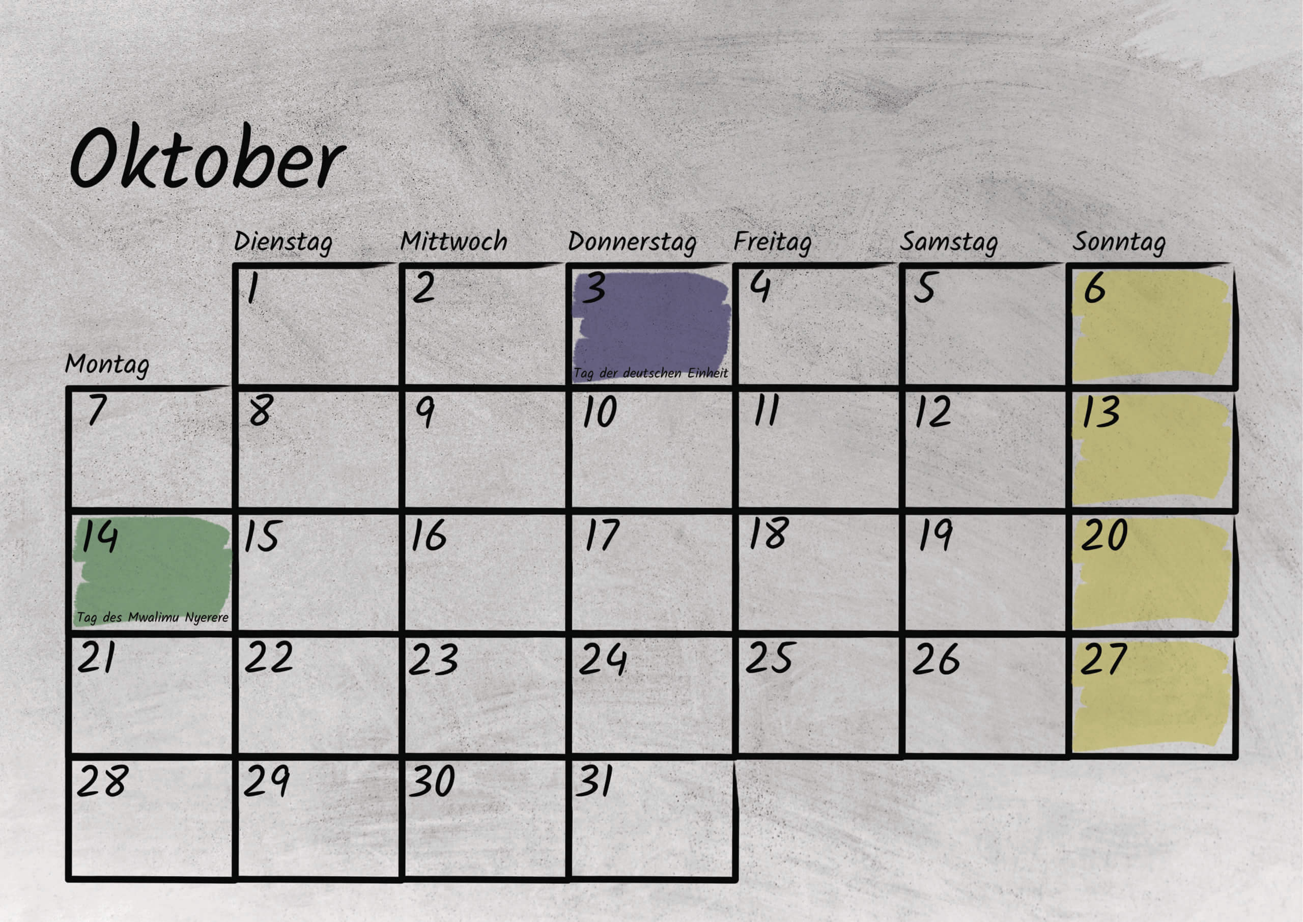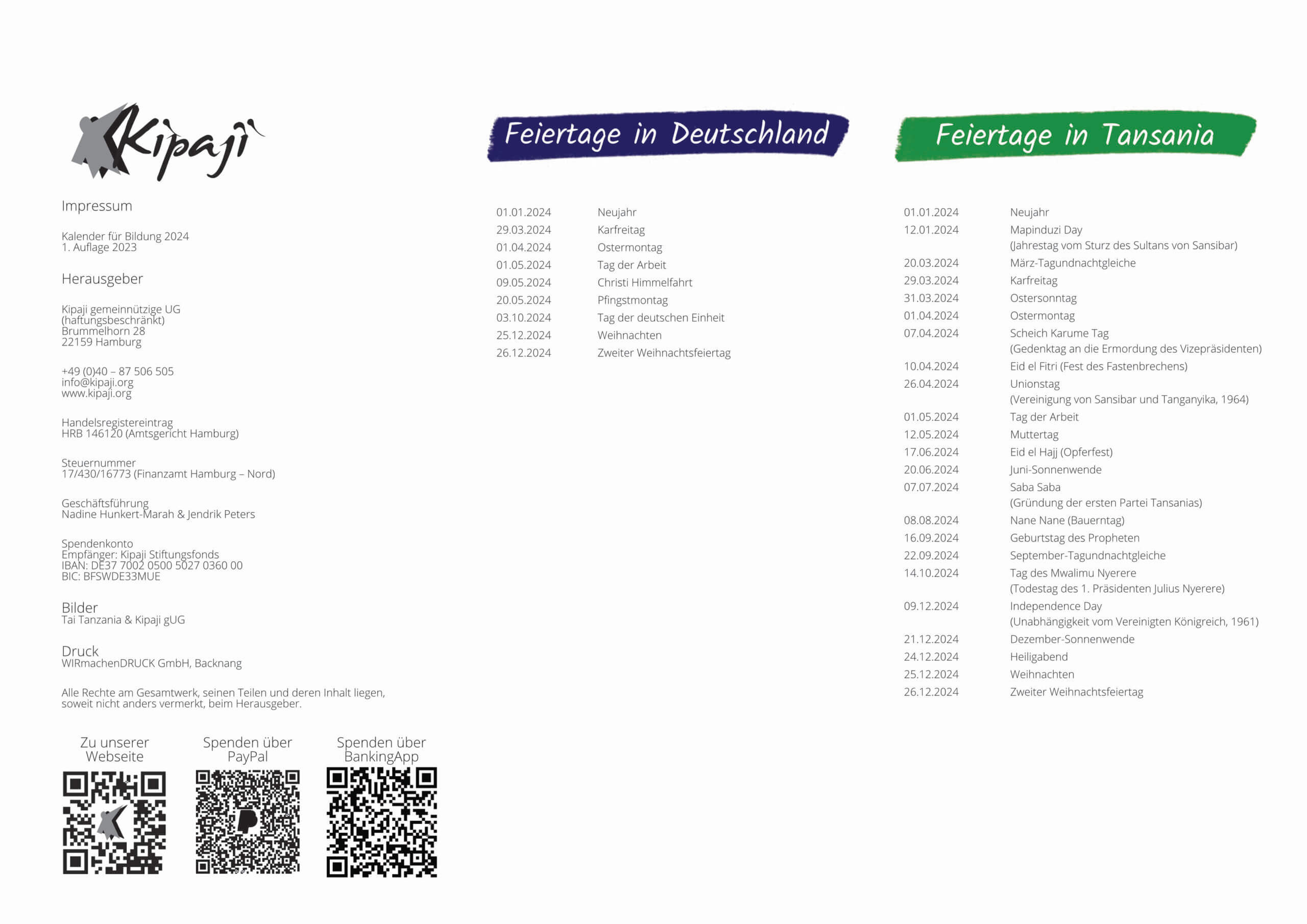 Im Kalendarium sind sowohl die bundesweiten deutschen, als auch die tansanischen gesetzlichen Feiertage mit Kurzerklärungen verzeichnet. Außerdem bietet das Kalendarium genug Platz für eigene Notizen oder Termine. Das Kalendarium ist sowohl mit Bleistift als auch Kugelschreiber beschreibbar.