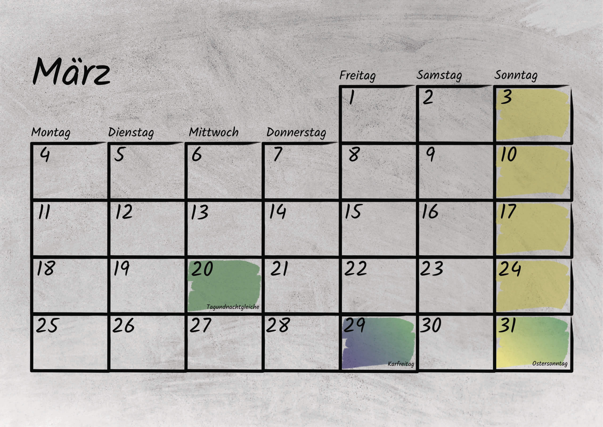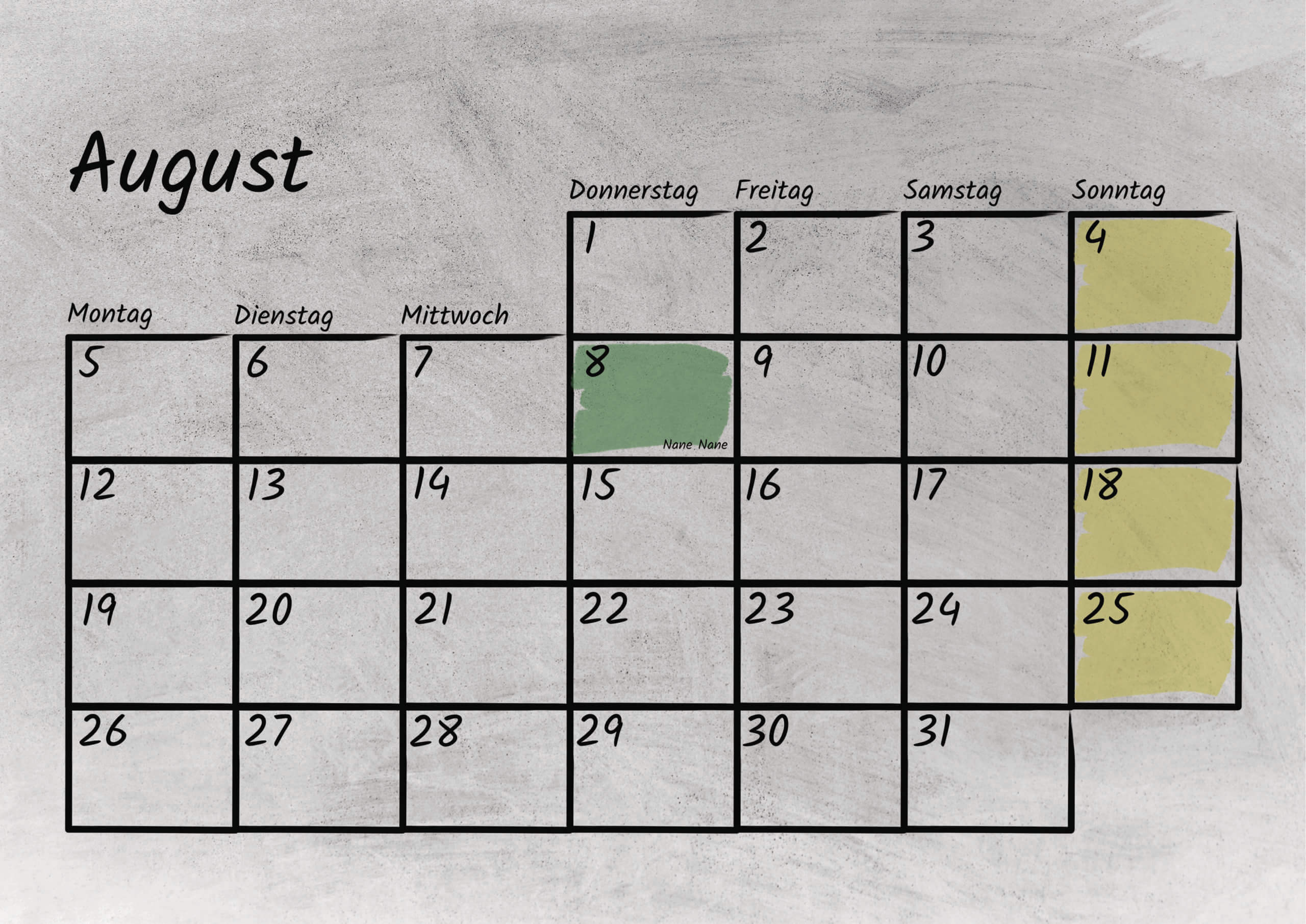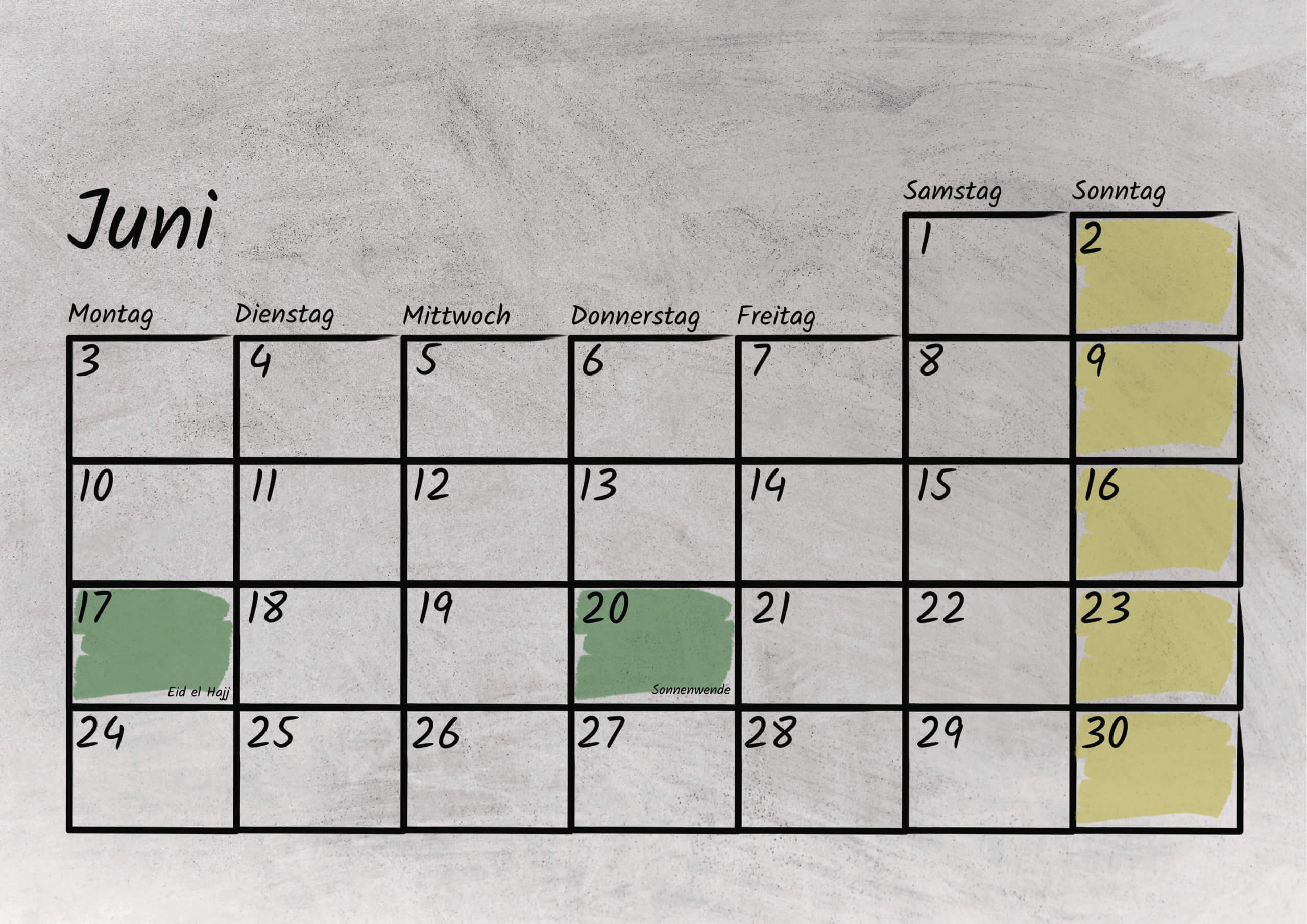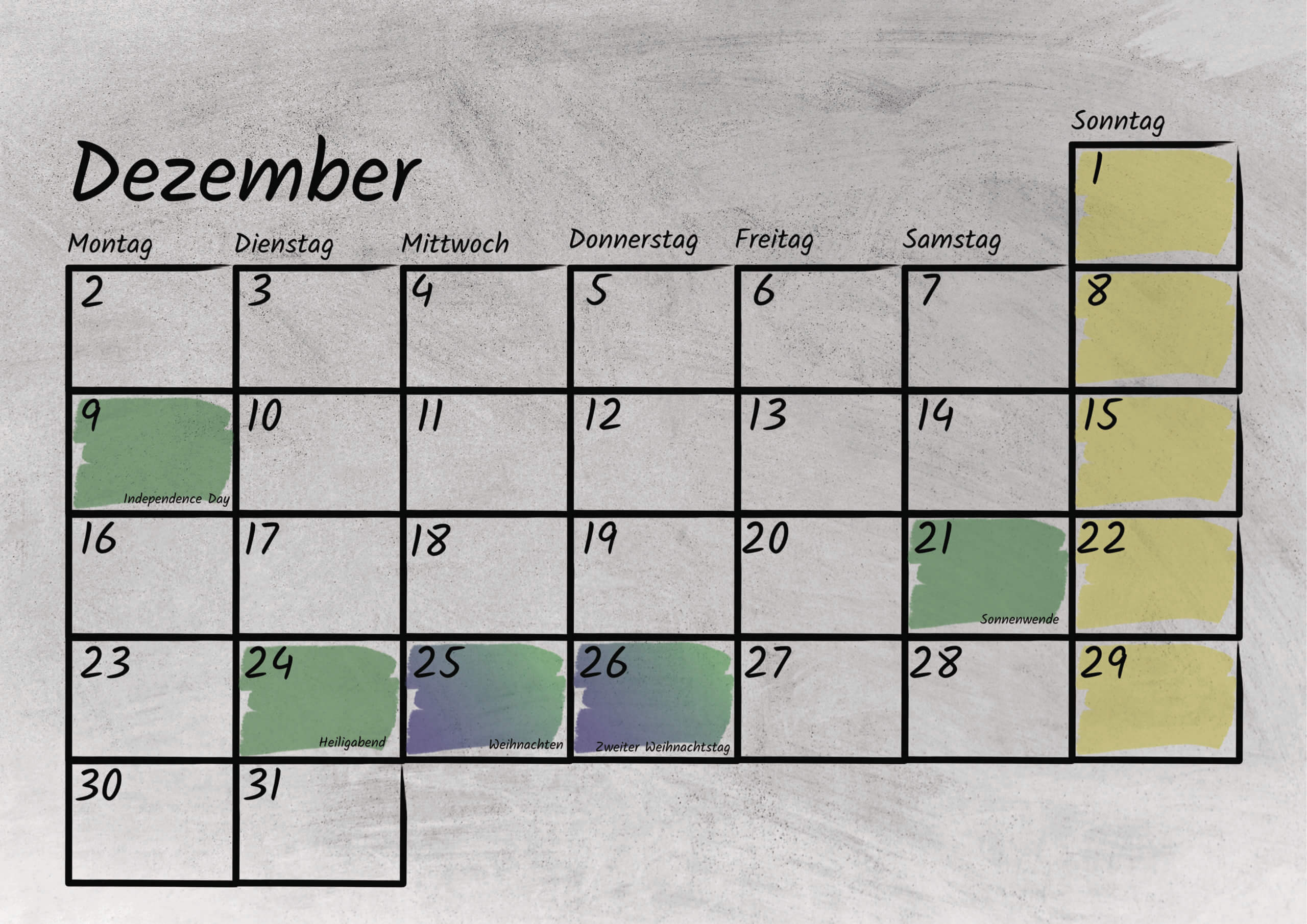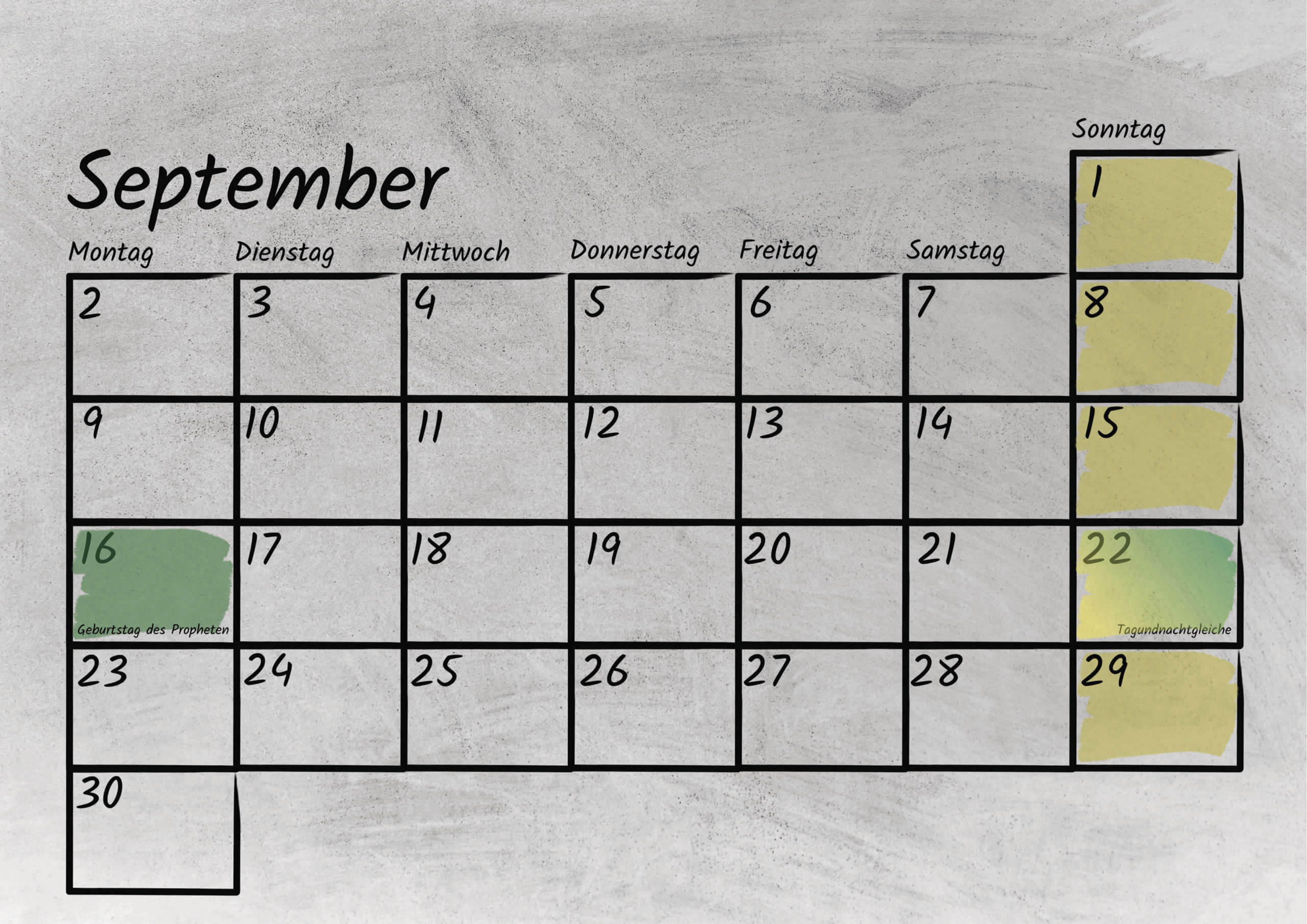 Im Kalendarium sind sowohl die bundesweiten deutschen, als auch die tansanischen gesetzlichen Feiertage mit Kurzerklärungen verzeichnet. Außerdem bietet das Kalendarium genug Platz für eigene Notizen oder Termine. Das Kalendarium ist sowohl mit Bleistift als auch Kugelschreiber beschreibbar.