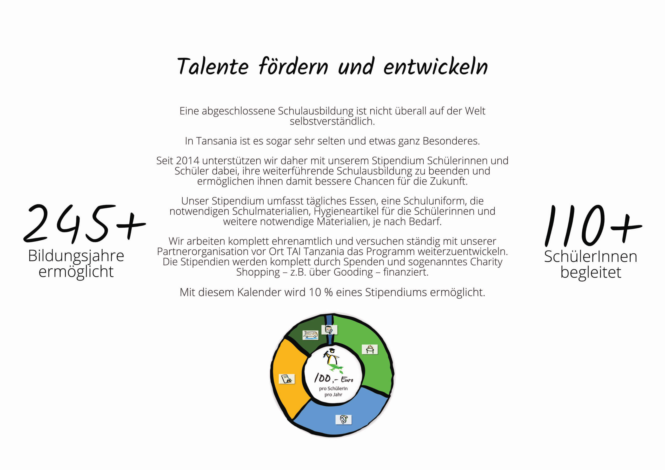 Die Einnahmen durch den Bildungskalender werden zu 100% für die Umsetzung unserer Bildungsstipendien verwendet.